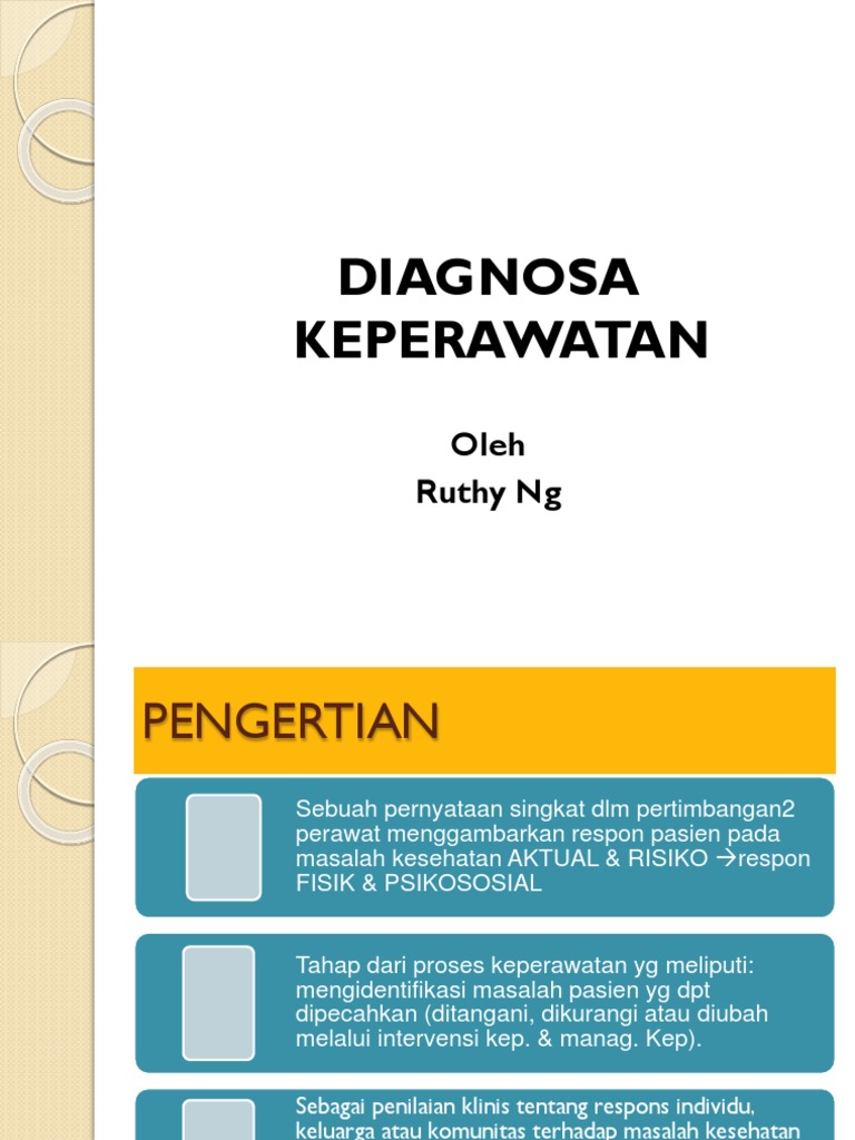 Diagnosis keperawatan merupakan penilaian klinis terhadap pengalamanrespon individu keluarga atau komunitas pada masalah kesehatan risiko masalah kesehatan atau pada proses kehidupan.